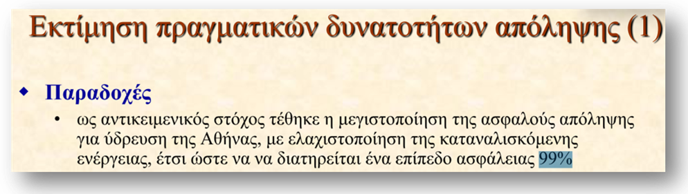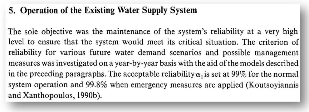 Ενώ εμείς εδώ αυξάνουμε το αποδεκτό ρίσκο, άλλες χώρες επιδιώκουν τη μείωσή του. Για παράδειγμα η Thames Water που υδρεύει το Λονδίνο και άλλες πόλεις στα δυτικά και νότιά του, μιλάει για ρίσκο 0.5% (αξιοπιστία 99.5%) στις τωρινές συνθήκες που προγραμματίζεται να μειωθεί στο 0.2% (αξιοπιστία 99.8%) το 2040:14