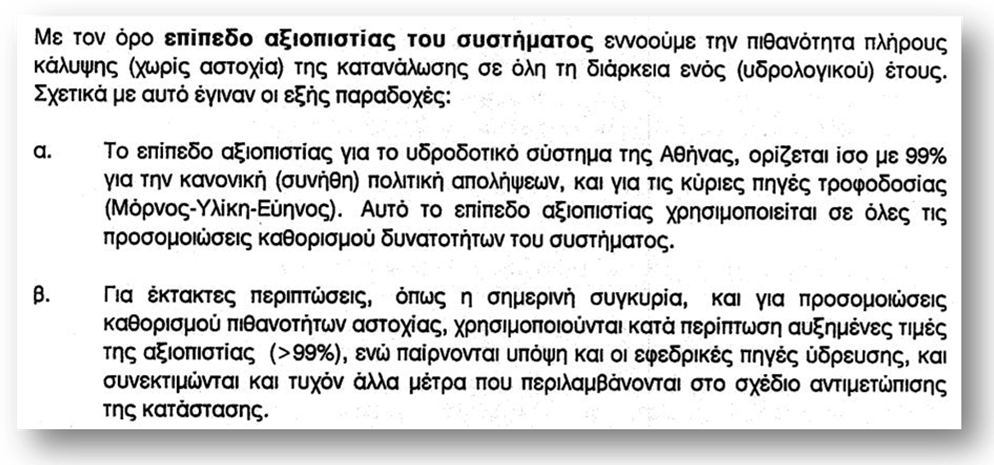 Διαβάζοντας την αναθεωρημένη διαχείριση υδατικών πόρων της Αθήνας (2019-2024) που έχει αναρτηθεί στον ιστότοπο του ΕΜΠ, δημιουργήθηκαν έντονοι προβληματισμοί και ερωτήματα, αν και κατά πόσο συμφωνείς (και ως πρωτεργάτης του διαχειριστικού σχεδίου μετά την μεγάλη λειψυδρία που ζήσαμε το 1990), με τις νέες μεθοδολογίες που εφαρμόζονται στην παρούσα, όπως επί παραδείγματι, είναι δυνατόν να είναι πλέον αποδεκτή μια στρατηγική με επίπεδο αστοχίας πολλαπλάσιο του 1% για την ύδρευση της Αττικής ?